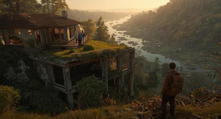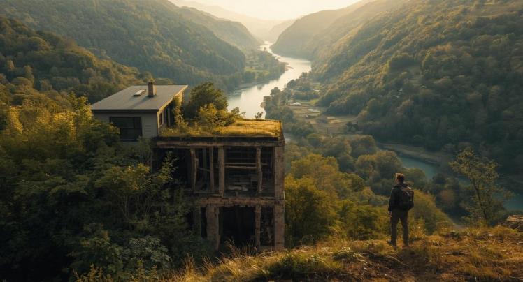 …On, nagu mind oleks juhatatud lõpuks ometi kodukohani, mida olen ammu otsinud. Imekaunis loodus, suurepäraste mosaiiksete vaadetega. Metsatukad, all orus looklev ja hommikupäikse kiirtes aurav lai jõesäng. Põhja poolt metsaga varjatud kõrgem küngas või mäekülg, mis on kõik kokku täiuslik unistuste kodu loomiseks. Lähemale jõudes selgub, et lausa minu ideaalmajaks täpselt sobiv vundamentki on olemas. Ainult, et… pool seda vundamenti on juba täis ehitatud. Sellel kõrgub kolmekordne kitsas koloss, millel esimese-teise korruse suured aknad vaatavad… valmis ehitamata vundamendi poole. See osa vundamendist on rohtu kasvanud, aknaist on vaade sellest üle.